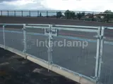 Pipe clamp fittings used with DDA Assist handrailing and mesh panelling to construct pedestrian barriers surrounding this velodrome.