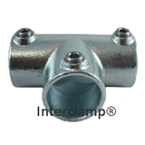 90° joint, often used to join intermediate uprights to top rails on level sites. This Interclamp can be used where through tube (horizontal in photo) has to be joined within the fitting. Where such a joint is not required, type 101 can often be used as an alternative.